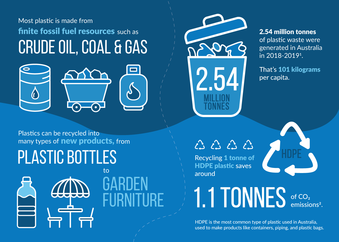 Recycling 1 tonne of HDPE plastic saves around 1.1 tonnes of CO2 emissions2. HDPE is the most common type of plastic used in Australia, used to make products like containers, piping, and plastic bags.